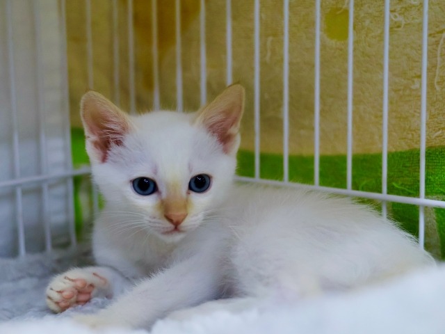 鼻もピンク、肉球ピンク、懐こさ抜群、グリーンアイ