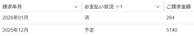 本来なら、12/末で引き落されるはずですが、しかし実際には、この264円も精算内で処理済みであり、MYD-ROOMには2026年1月分の請求として"お支払い済"と反映されていました。