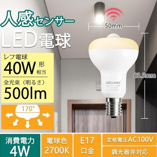 できれば、より明るくなるようにE17電球(ミニクリプトン)用から、E26の人感センサーライトが取付けれると嬉しいなぁ。