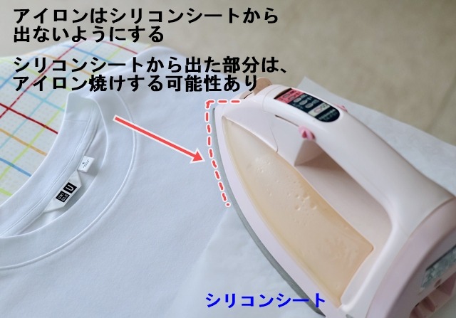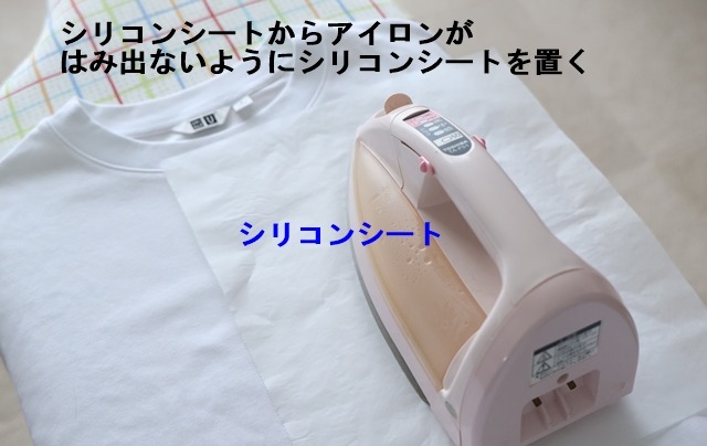 端っこでケチってすると、シリコンシートよりはみ出たアイロンの部分が、大切なTシャツおよびアイロン台を焼いてしまいます。