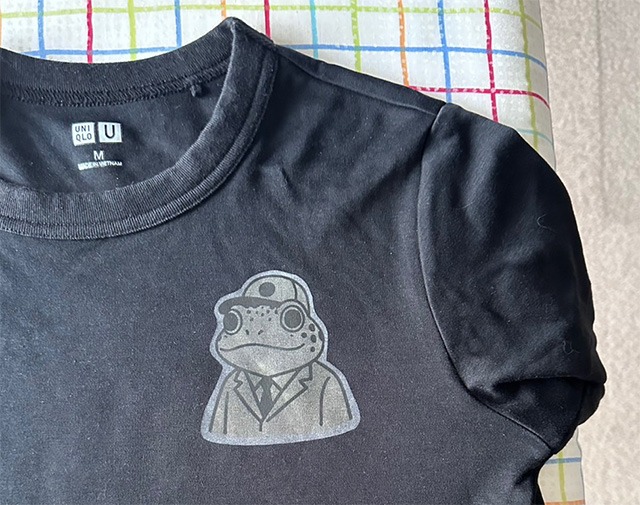 今度は薄クリーム色のカエルを真っ黒のTシャツにプリントしてみました。